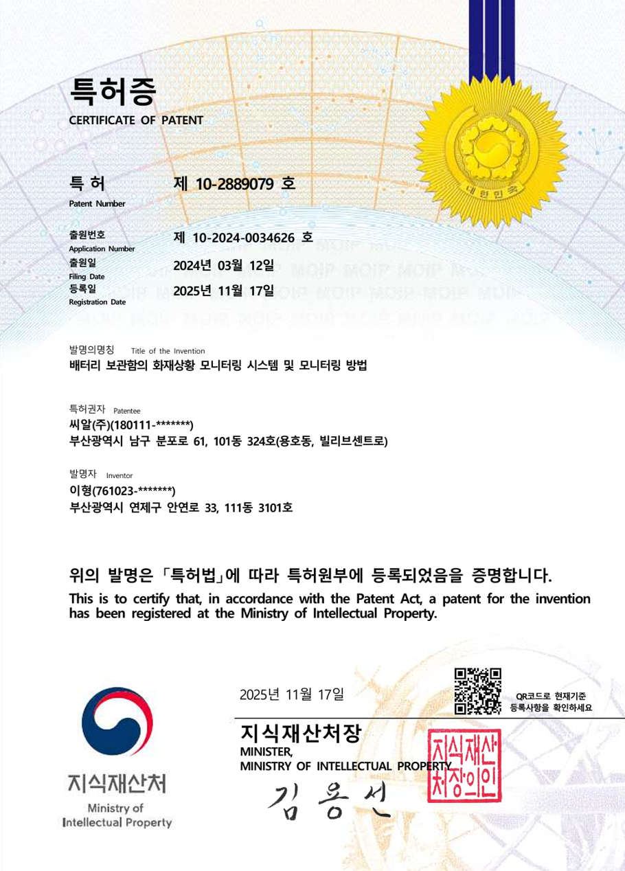 - 배터리보관함 화재 모니터링 기술 특허 등록